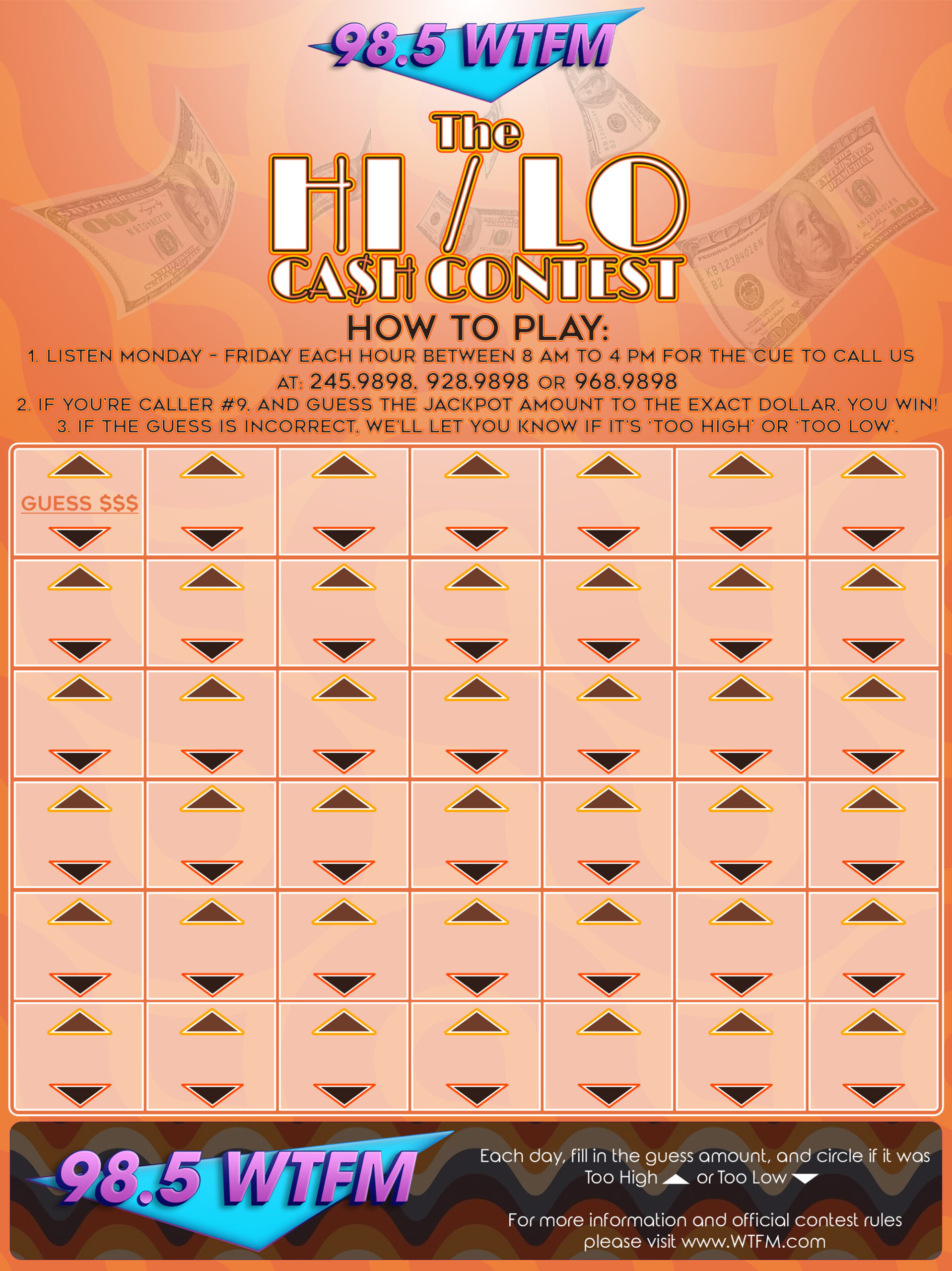 The 98.5 WTFM HI / LO CA$H Contest Starts Monday November 3rd! We’ll give you multiple chances each weekday to call and guess the CA$H JACKPOT between the ‘even number‘ hours 8 AM till 4 PM…